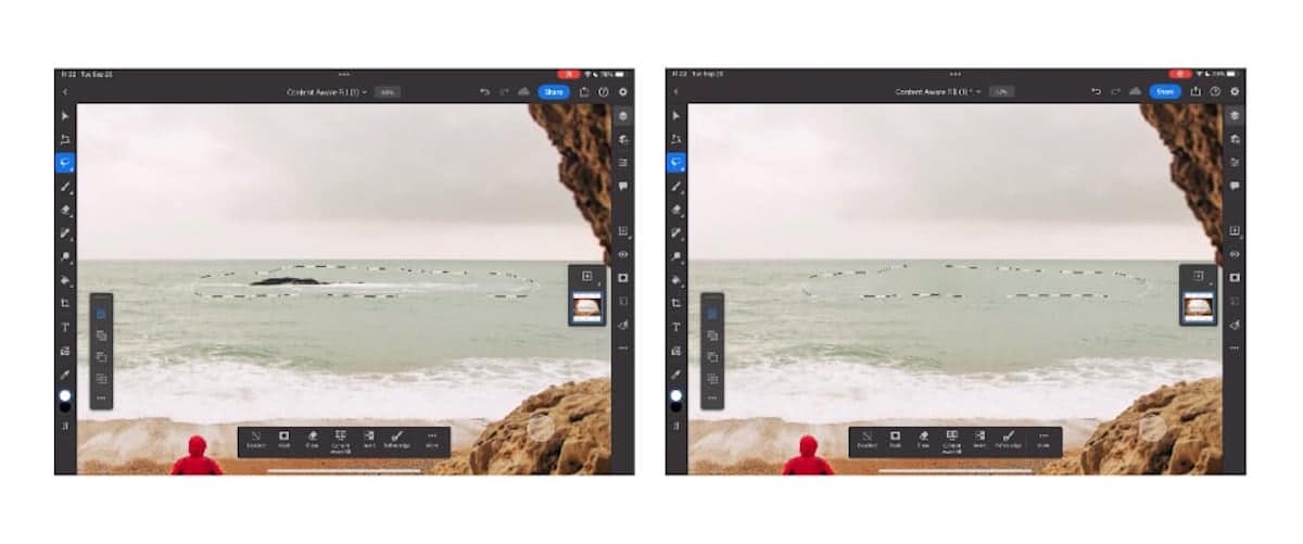 - Jedno kliknięcie, usuń i wypełnijaby szybko usunąć elementy z obrazu i automatycznie wypełnić obszar za pomocą wypełnienia z uwzględnieniem zawartości.