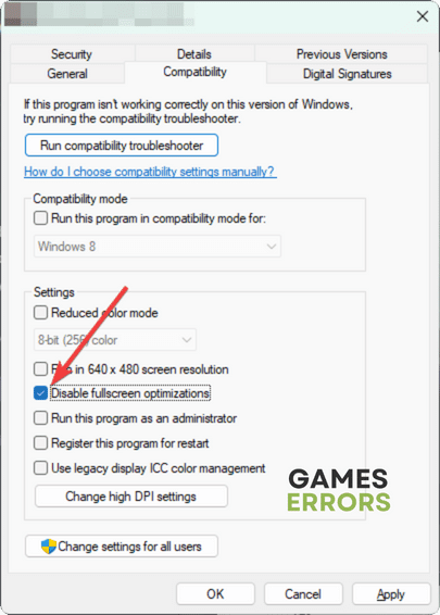 - SprawdzaćWyłącz optymalizację pełnoekranową dla tej aplikacji.