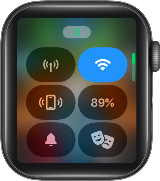 Dotknięcie ikony Wi-Fi powoduje przełączenie połączenia Wi-Fi na zegarku Apple Watch.