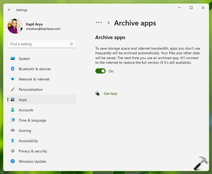 Jeśli zarchiwizujesz aplikację, której nie używasz często, pliki i dane z tej aplikacji zostaną zapisane na Twoim urządzeniu. Jedyna różnica będzie taka, że gdy następnym razem zdecydujesz się użyć tej aplikacji, system Windows 11 będzie musiał pobrać tę aplikację z Internetu lub sklepu, pod warunkiem, że aplikacja jest dostępna u jej dostawcy. W systemie Windows 11 możesz włączyć archiwizację aplikacji dla swojego konta użytkownika lub dowolnego innego konta użytkownika obecnego w systemie.