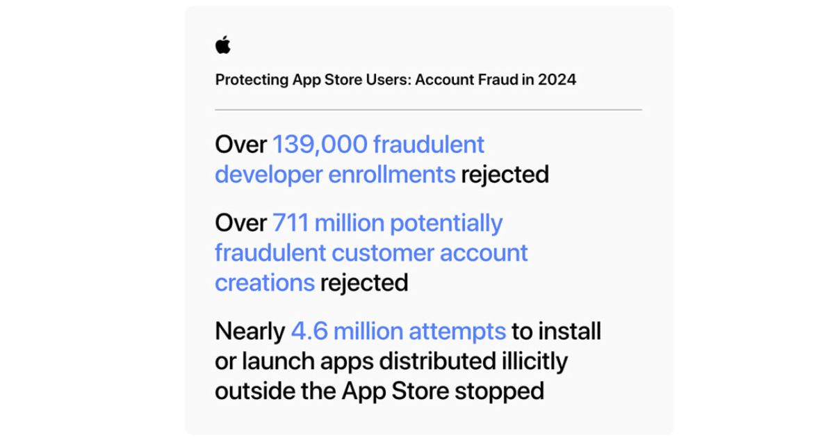 Sama skala działań Apple w zakresie zwalczania nadużyć finansowych w 2024 r. pokazuje nieustanną walkę ze złośliwymi podmiotami. Ponad 146 000 kont programistów zostało zamkniętych z powodu oszustwa, a dodatkowe 139 000 prób rejestracji programistów zostało odrzuconych. Po stronie konsumentów Apple zablokował ponad 711 milionów utworzonych kont i dezaktywował prawie 129 milionów istniejących kont, a wiele z nich próbowało manipulować rankingami i recenzjami App Store.