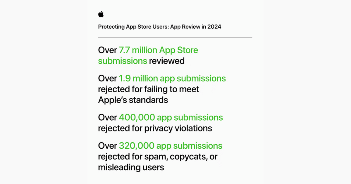 Rygorystyczny proces przeglądu aplikacji pozostaje kluczową linią obrony. W 2024 r. firma Apple sprawdziła ponad 7,7 mln aplikacji przesłanych do aplikacji, odrzucając ponad 1,9 mln ze względu na niespełnienie rygorystycznych standardów. Odrzucenia te dotyczyły bezpieczeństwa, niezawodności, komfortu użytkownika i naruszeń prywatności.