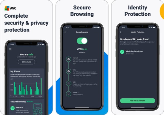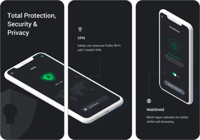 TotalAV korzysta z usług filtrowania witryn i VPN do ochrony iPhone'a przed inwazją wirusową online. Oferuje także usługi Web Shield, VPN, Antifraud i Antitheft jako dodatkowe funkcje. Istnieje również reporter przeciekania danych do zeskanowania Internetu w celu wykrycia wiadomości e -mail w naruszeniach danych.