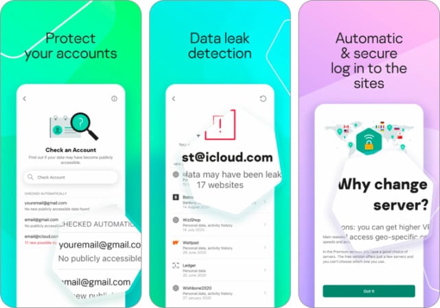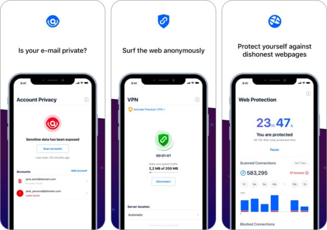Podobnie jak wiele innych aplikacji antywirusowych, aplikacja zawiera usługi VPN, aby maskować swoją obecność online. Istnieje również program prywatności konta, który zeskanuje Twój identyfikator e -maila w celu jego zaangażowania w naruszenie bezpieczeństwa. To mówi, gdzie twoje dane zostały wyciekane i zaleca, jak je chronić.