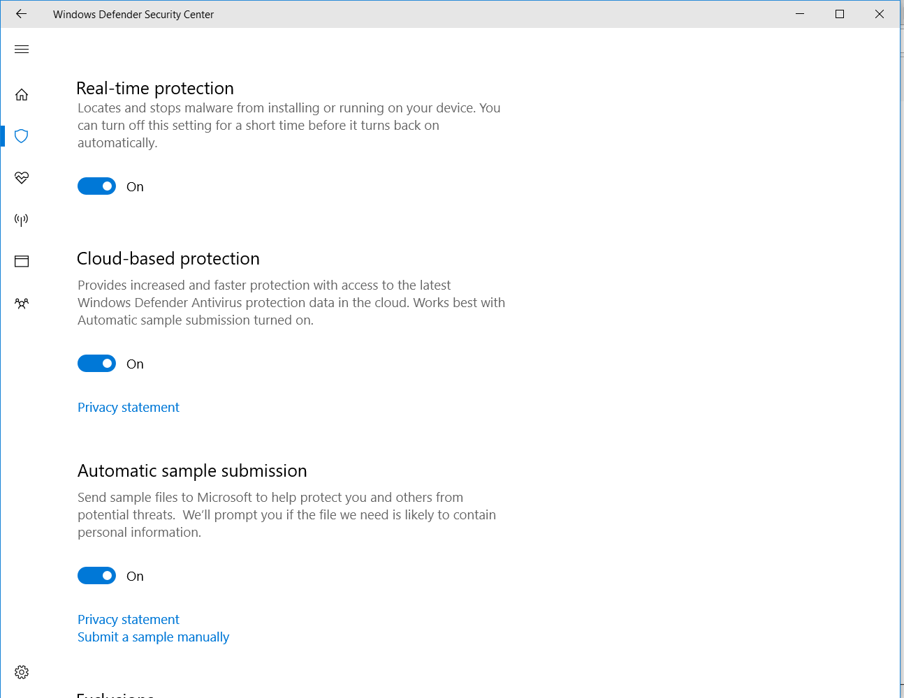 Ponadto, jeśli przejdziesz do „Konfiguracja>> Aktualizacja& Bezpieczeństwo",możesz używać chmury Microsoft do analizowania zagrożeń i wysyłania próbek. Możesz także wykluczyć pliki, foldery, typy plików, a nawet procesy, jeśli im ufamy.