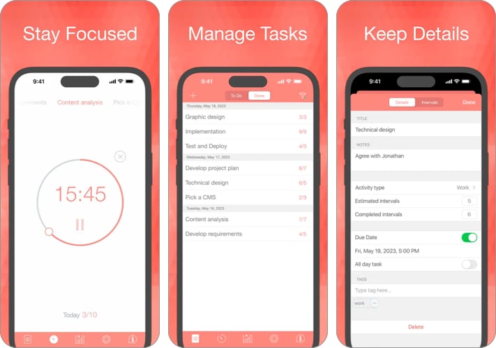Możesz tworzyć zadania cykliczne lub jednorazowe i wybierać ustawienia dźwięku dla każdego zadania dotyczące skupienia, przerw i alarmów. Możesz także dodawać notatki do swoich zadań do wykonania w miarę odliczania czasu, przeglądać dzienny, tygodniowy lub miesięczny przegląd lub oś czasu oraz sprawdzać całkowity czas spędzony na swoich zadaniach.