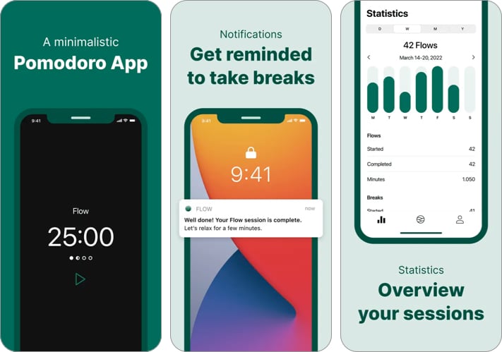 Aby uzyskać minimalistyczne podejście do timera skupienia, sprawdź aplikację Flow – Focus & Pomodoro Timer. Masz trzy proste ekrany – jeden dla timera, jeden dla ustawień i jeden dla statystyk.