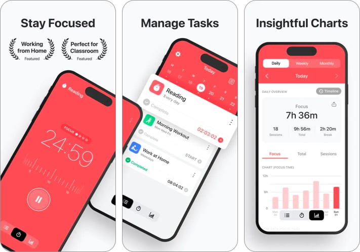 Aplikacja zapewnia różne sposoby skupienia się, od minutnika Pomodoro, przez stoper, aż po minutnik. Dzięki temu możesz wybrać najlepsze dla siebie narzędzie do koncentracji.