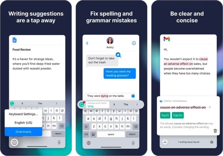 Oprócz sugestii dotyczących pisowni, gramatyki i zwięzłości, oferuje wykrywanie tonu, przewidywanie tekstu i emoji, inteligentną autokorektę i wiele więcej. Jego aplikacja zawiera pełnoprawny edytor dokumentów z tymi samymi funkcjami, co Grammarly Web, w tym statystykami pisania, zarządzaniem dokumentami w chmurze, kompleksową informacją zwrotną na temat pisania i nie tylko.