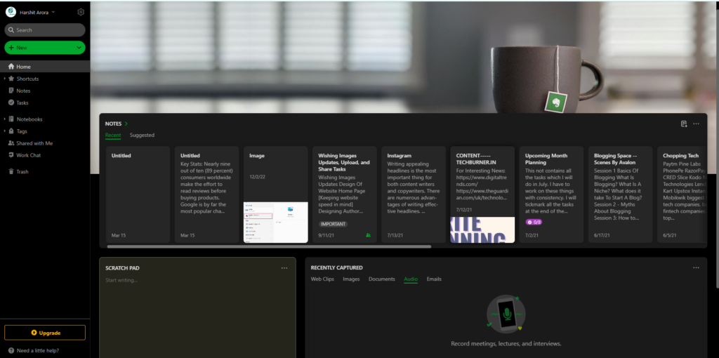 Evernote oferuje m.inbardzo łatwy interfejs użytkownika, który jest dość łatwy w użyciu. Po lewej stronie znajduje się intuicyjny pasek boczny, za pomocą którego można poruszać się po różnych sekcjach programu. Poza tym wszystkie swoje notatki widzisz w głównym interfejsie programu. Nie musisz głębiej zagłębiać się w aplikację, aby uzyskać dostęp do swoich notatek, ponieważ wszystko jest dostępne w pierwszej kolejności.