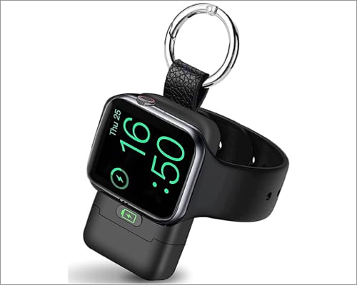 Poza tym ładowarka ma lekką konstrukcję i niewielkie rozmiary, dzięki czemu można ją trzymać w dłoni bez uczucia obciążenia. Dzięki smyczy możesz zawiesić ładowarkę na haczyku lub łańcuszku w torbie. Zaufaj mi, jeśli tak jak ja jesteś zapominalską istotą, projekt pęku kluczy uchroni Cię przed zapomnieniem lub zgubieniem ładowarki Apple Watch.