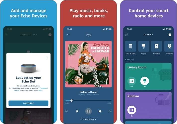 Ta aplikacja, obsługiwana przez Alexę, jest dość popularna na iOS. Został zaprojektowany do współpracy z urządzeniami Amazon Echo. Za pomocą aplikacji możesz nie tylko zarządzać urządzeniami obsługującymi Alexę, ale także odtwarzać muzykę, słuchać radia, tworzyć listy zakupów, otrzymywać aktualizacje wiadomości i sterować inteligentnymi urządzeniami domowymi.