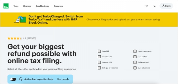 Znany ze swojej prostoty, H&R Block to kolejne błogosławieństwo w nieszczęściu, stworzone, aby pomóc Ci w procesie składania zeznań podatkowych. Jest to idealne rozwiązanie dla osób poszukujących intuicyjnej i łatwej w obsłudze metody rozliczania podatków. Zdobądź ekskluzywne funkcje, takie jak ulgi podatkowe i optymalizacja kredytu, a także dobrze zorganizowaną pomoc profesjonalistów z H&R Block.