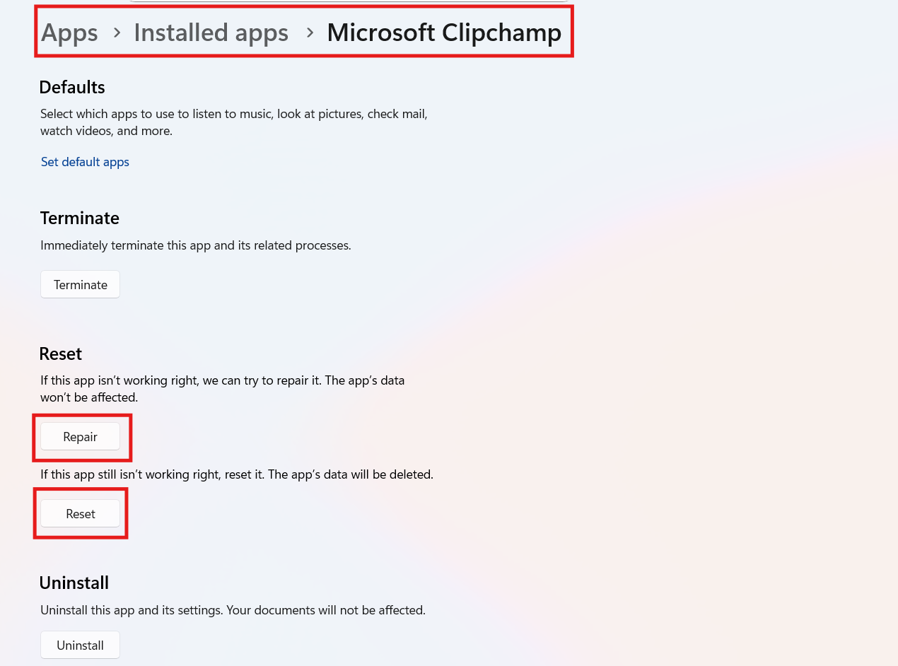 Poprawka 1: napraw lub zresetuj Clipchamp