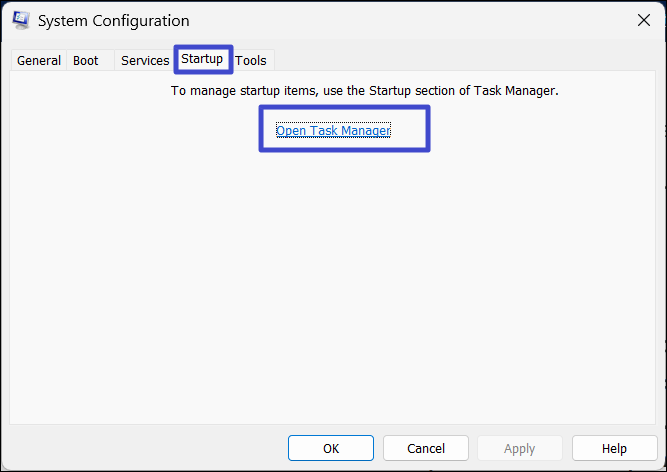 5. Przejdź do „Uruchomienie” i kliknij „Otwórz Menedżera zadań“.