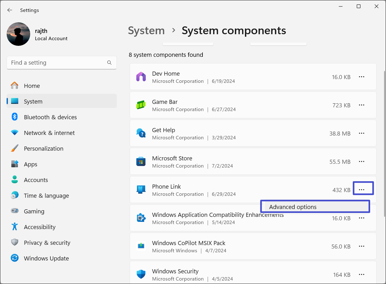 3. Kliknij znajdujący się obok niego przycisk z trzema kropkami i wybierz „Opcje zaawansowane“.