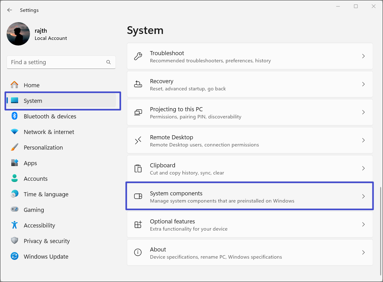 1. Otwórz aplikację Ustawienia systemu Windows, przejdź do „System” i wybierz opcję „Skomponenty systemu” po prawej stronie.