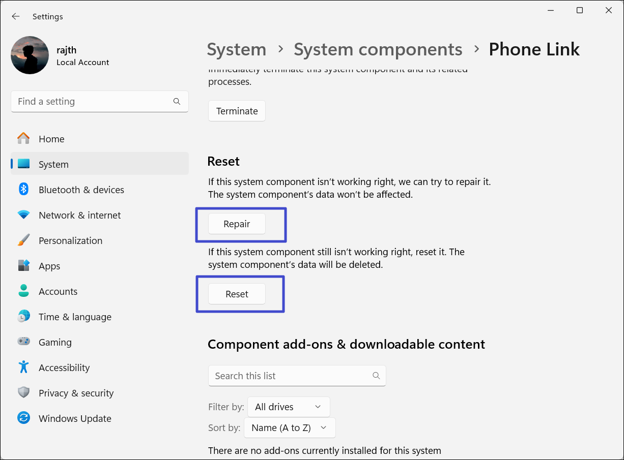 4. Na następnej stronie przewiń w dół i kliknij „Naprawa”. Jeśli to nie zadziała, możesz także spróbować zresetować komponent.