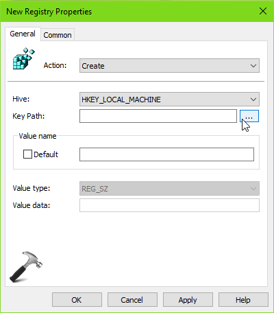 4.Następnie w obszarze Właściwości nowego rejestru wybierz opcję Akcja jakoTworzyćaby wdrożyć nowy klucz rejestru. Wybierz opcję Hive, a następnie kliknij przycisk przeglądania.