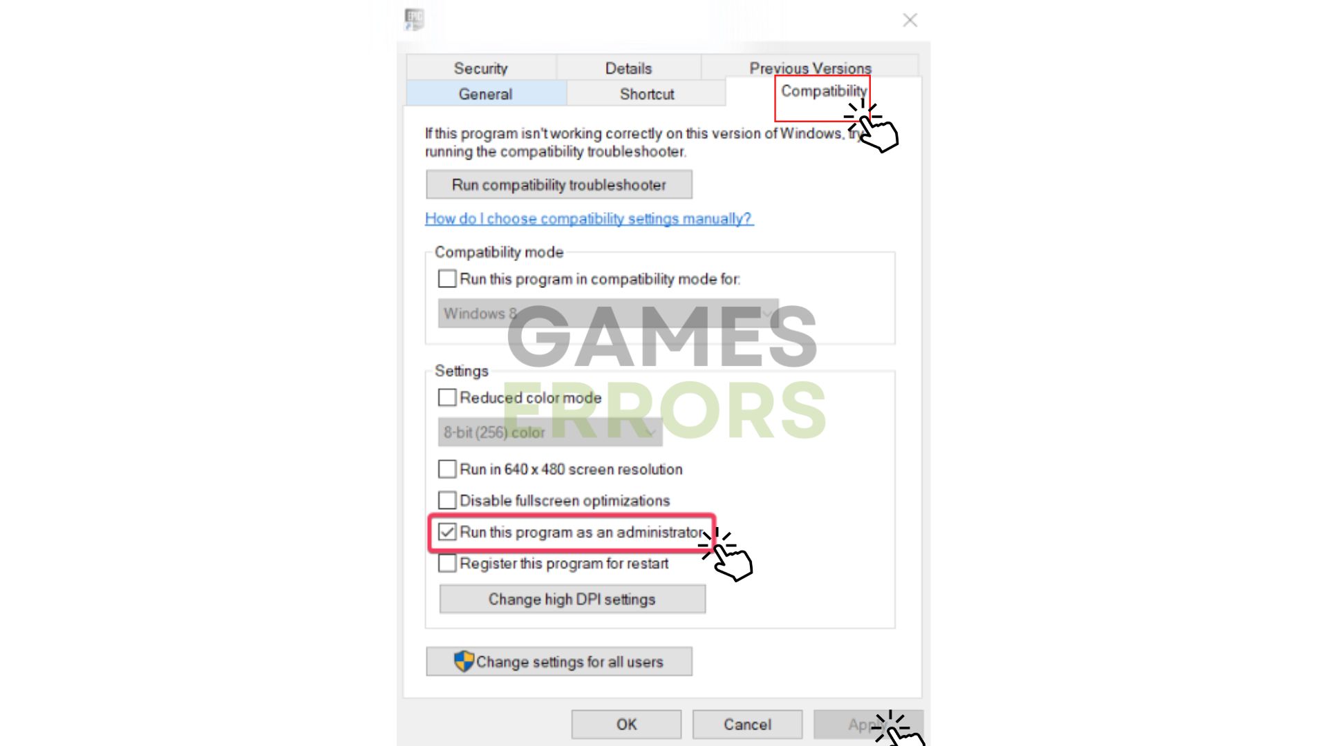 - Kliknij kartę Zgodność i wybierzUruchom ten program jako administratoropcja.