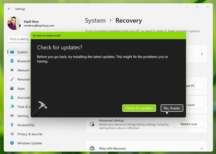 Odinstalowanie bieżącej wersji i przejście na poprzednią w systemie Windows 11 jest dość łatwe. Firma Microsoft uwzględniła już w systemie Windows 11 opcję przywracania poprzedniej wersji w sekcji odzyskiwania w aplikacji Ustawienia.