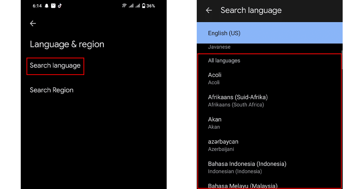 - Stuknij w „Wyszukaj język” i pod „Wyszukaj język”, wybierz preferowany język z listy.