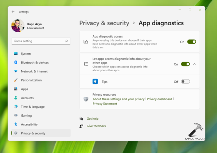 Aby włączyć/wyłączyć dostęp do diagnostyki aplikacji w systemie Windows 11 na urządzeniu osobistym, wykonaj poniższe kroki.