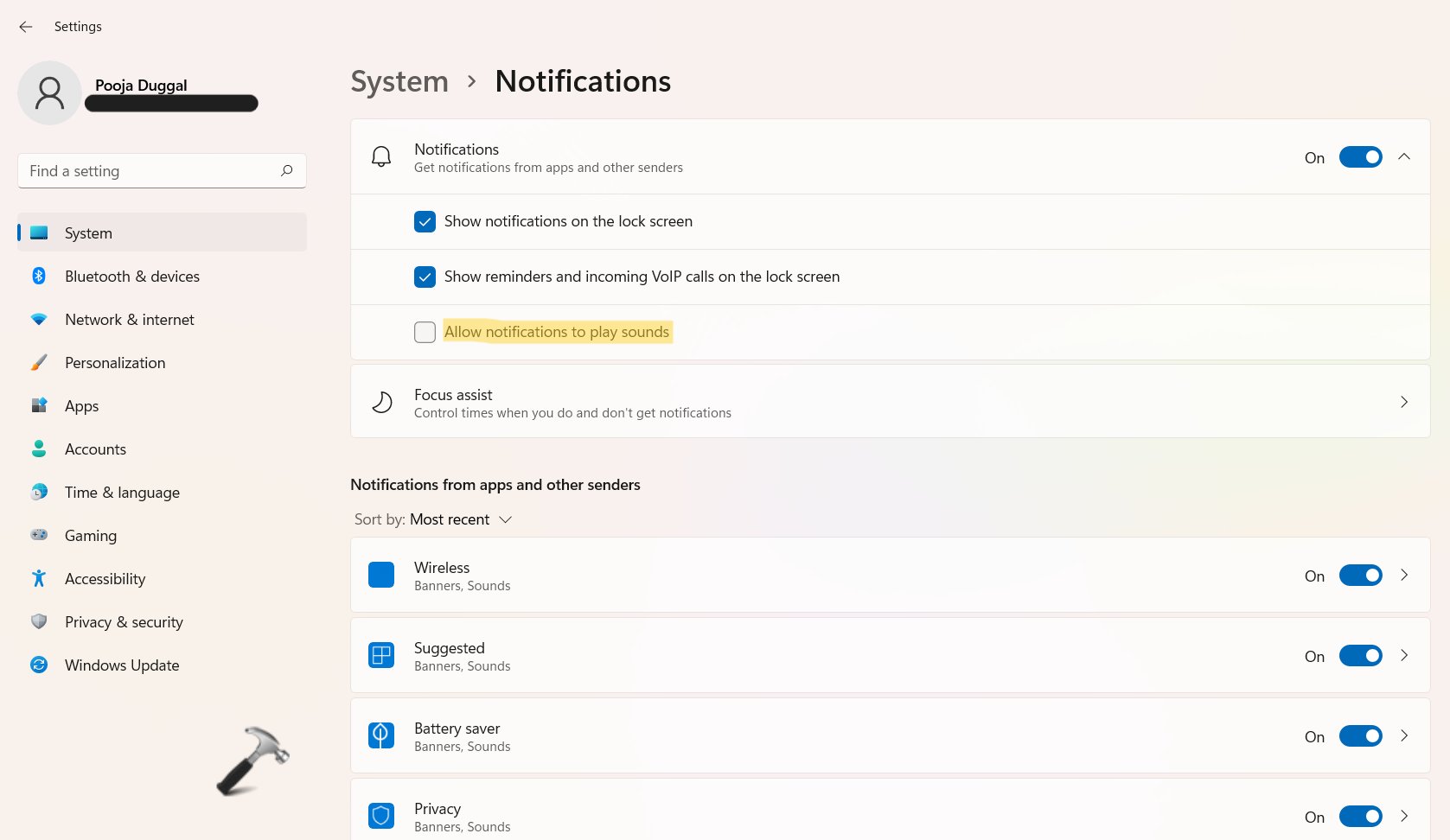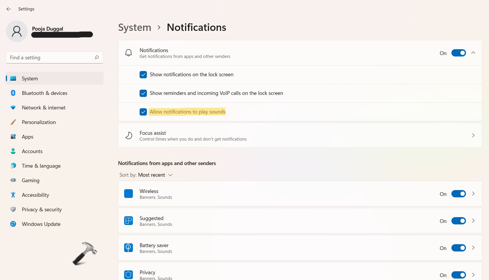 Metoda 1 – Włącz/wyłącz dźwięki powiadomień dla wszystkich nadawców w Ustawieniach