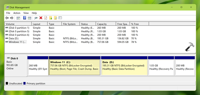 Po włączeniu szyfrowania urządzeń możesz otworzyć zarządzanie dyskami, a tutaj przekonasz się, że dyski urządzenia są teraz szyfrowane Bitlocker. Wskazuje to, że szyfrowanie urządzeń jest teraz włączone w domu Windows 11.