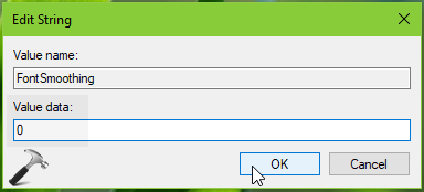 4.Ustaw Dane wartości na0aby wyłączyć wygładzanie czcionek. TrzaskOK. Podobnie kliknij dwukrotnieFontSmoothingTypezarejestruj DWORD (REG_DWORD) i ustaw jego dane wartości na1, ponownie, aby wyłączyć wygładzanie czcionek. TrzaskOKi zamknij Edytor rejestru.