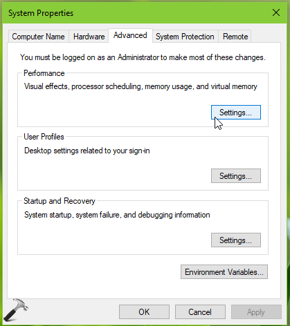 2.W oknie Właściwości systemu włączZaawansowanyzakładkę, kliknijUstawieniapod nagłówkiem Wydajność.