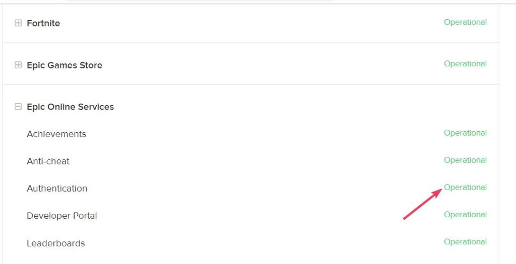 Najpierw sprawdź, czy występują jakieś zauważalne problemy z usługą Epic Games. Aby to zrobić, otwórz plikStrona stanu Epic Games. Następnie kliknij dwukrotnie kategorie, takie jak Epic Games Store i Epic Online Services, aby sprawdzić ich stan działania.