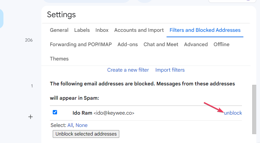 Sposób odblokowywania wiadomości e-mail różni się w zależności od usług poczty e-mail i aplikacji. Jednak często możesz znaleźć zablokowane e-maile w ustawieniach filtra. Na przykład w Gmailu możesz kliknąćUstawienia>Zobacz wszystkie ustawienia>Filtry i zablokowane adresyaby wyświetlić zablokowane domeny e-mail.