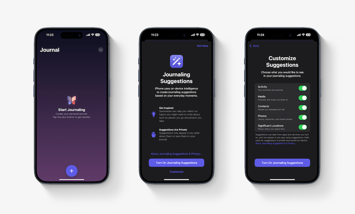 Aplikacja Journal jest wreszcie dostępna w systemie iOS 17.2. Aplikacja pozwala użytkownikom dokumentować swoje myśli, uczucia i działania na iPhone'ach lub iPadach, aby zadbać o swoje zdrowie psychiczne. Użytkownicy mogą także dodawać zdjęcia, treningi i preferencje muzyczne do swoich wpisów w dzienniku oraz otrzymywać sugestie tematów, o których warto pisać. Wszystkie dane w aplikacji są chronione hasłem lub identyfikatorem twarzy i kompleksowym szyfrowaniem. Sugestie są przetwarzane na urządzeniu.