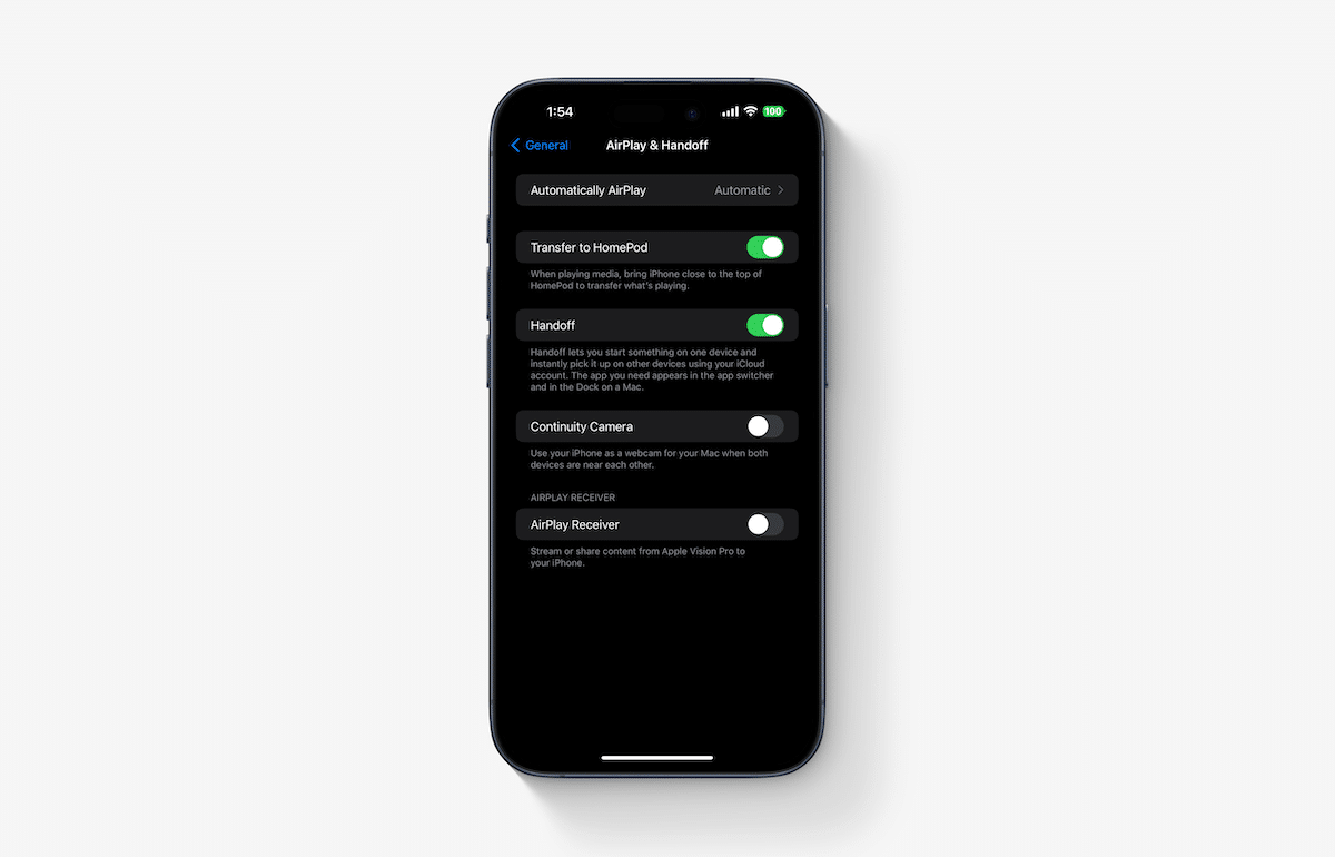 - W aplikacji Ustawienia plikSekcja AirPlaydodał opcję „Przesyłaj strumieniowo lub udostępniaj zawartość z Apple Vision Pro do swojego iPhone’a”.