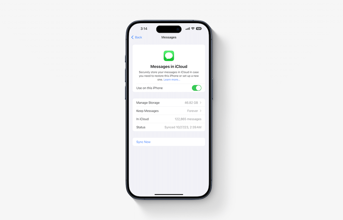 W aplikacji Ustawienia, iCloud zmienił nazwę sekcji Wiadomości na „Wiadomości w iCloud” i wyświetla informacje o liczbie wiadomości zsynchronizowanych z iCloud, czasie ostatniej synchronizacji i całkowitej liczbie zajętych wiadomości. Posiada również funkcję „Synchronizuj teraz” umożliwiającą ręczne aktualizacje.