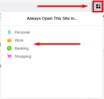 - W pasku adresu przeglądarki Firefox wybierz opcjęKontenery z wieloma kontami Dodaj ikonę witryny. Z rozwijanego menu wybierz kategorię, w której chcesz go umieścić.