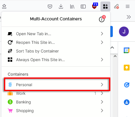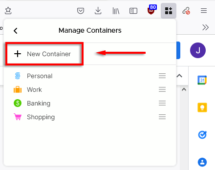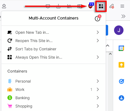 Po zainstalowaniu dostęp do kontenerów wielokontowych można uzyskać łatwo, naciskając przyciskIkona kontenerówna pasku narzędzi. Wygląda to jak trzy kwadraty i symbol plusa.