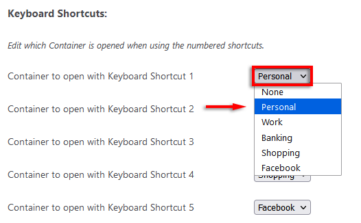 Naciskając można otwierać całe pojemnikiklawisz kontrolny+Zmiana+1–9. Możesz także zmienić kontener aktywowany przez każdy skrót: