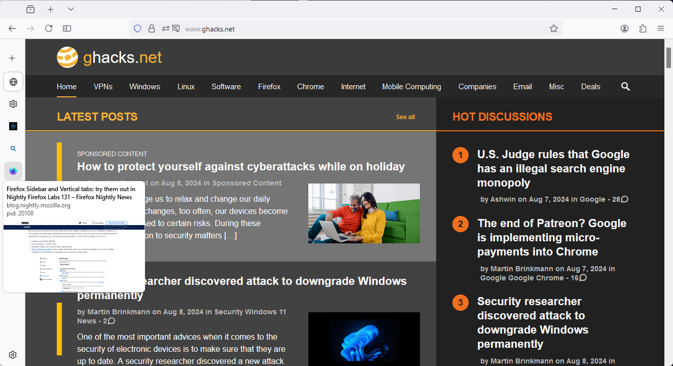 Najnowsza wersja przeglądarki Firefox Nightly ułatwia testowanie pionowych zakładek i nowego paska bocznego przeglądarki.
