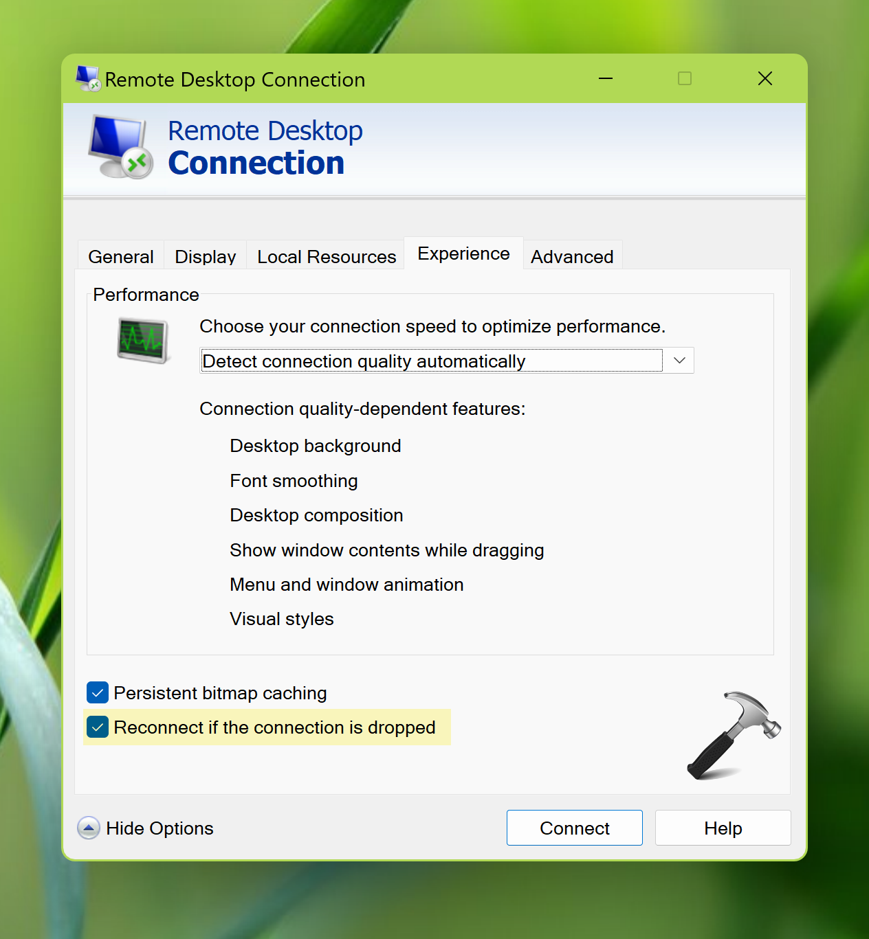 - Przejdź do zakładki Doświadczenie i upewnij się, że pole „Połącz ponownie, jeśli połączenie zostanie zerwane” jest zaznaczone