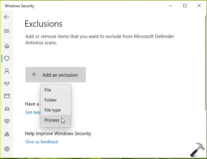 4.Następnie kliknij Dodaj wykluczenie i wybierzProcesw menu rozwijanym.