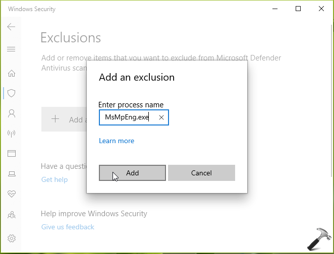 5.W polu Dodaj wykluczenie wpiszMsMpEng.exei kliknijDodać.