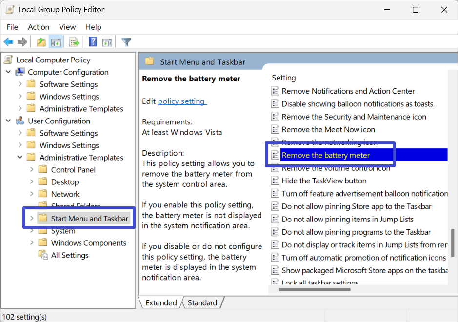 3. W panelu po lewej stronie wybierz „Menu Start i pasek zadań„, następnie przewiń prawy panel w dół i kliknij dwukrotnie ikonę „Wyjmij miernik bateriiopcja.