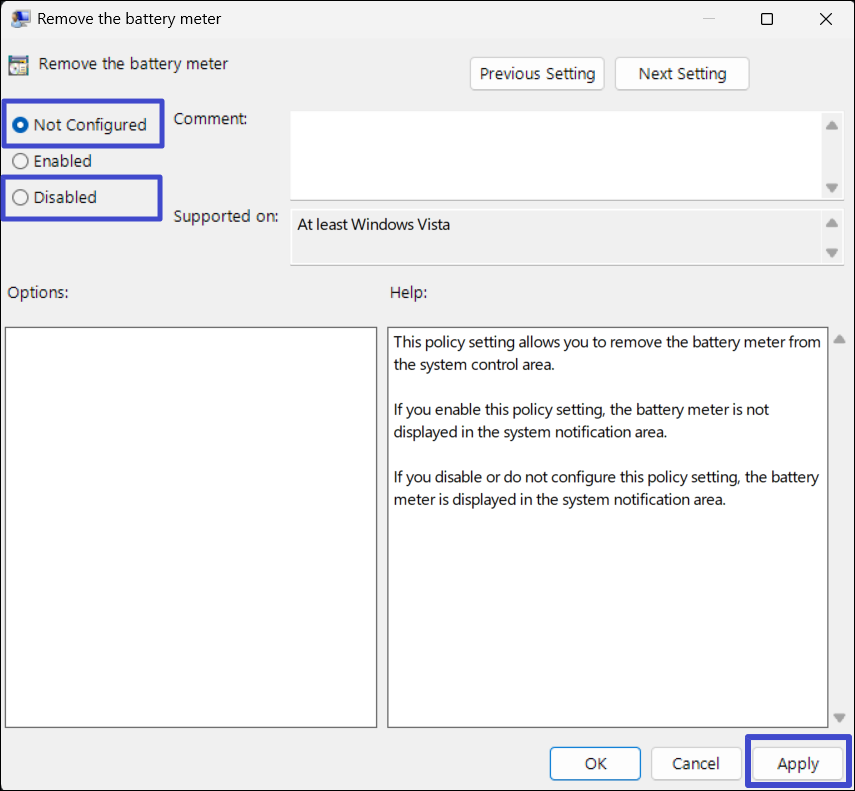 4. Następnie wybierz „Nie skonfigurowano" Lub "Wyłączony„, kliknij”Stosować", I "OK„.