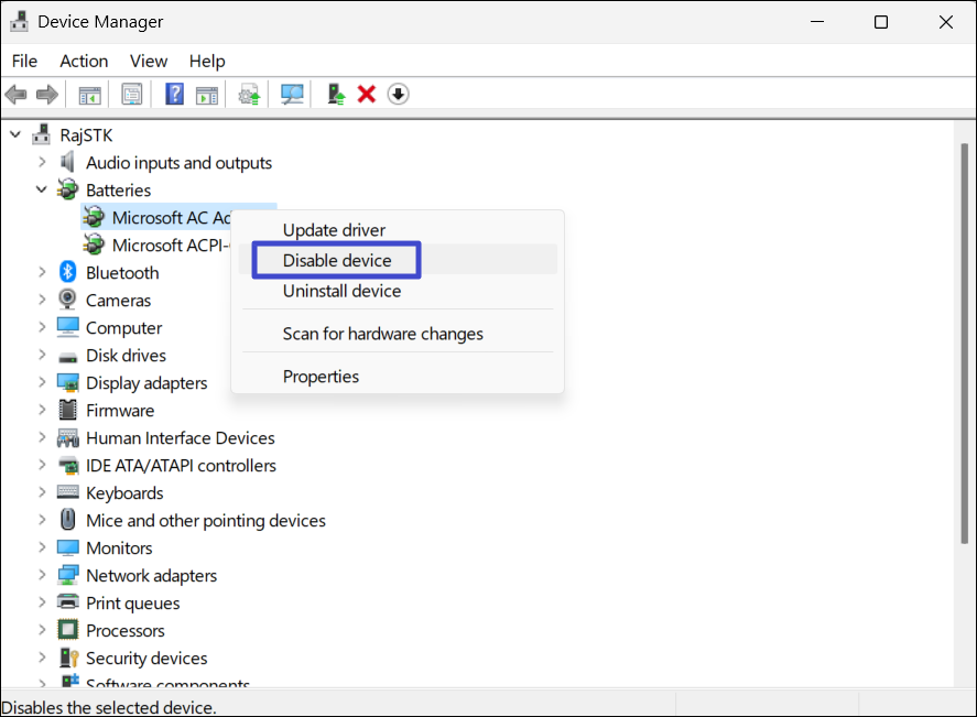 4. Kliknij prawym przyciskiem myszy „Zasilacz sieciowy Microsoftu”urządzenie i wybierz „Wyłącz urządzenie„.
