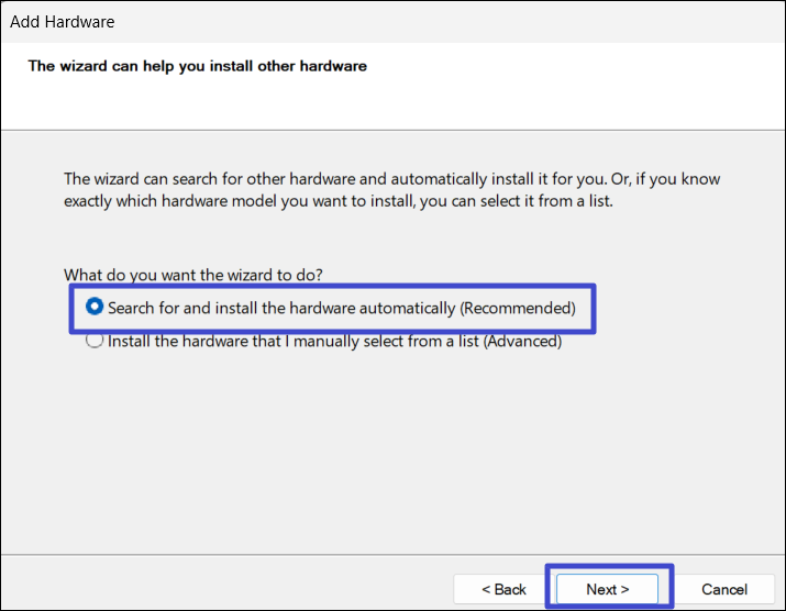 4. Wybierz „Wyszukaj i zainstaluj sprzęt automatycznie (zalecane)i kliknij „Następny".