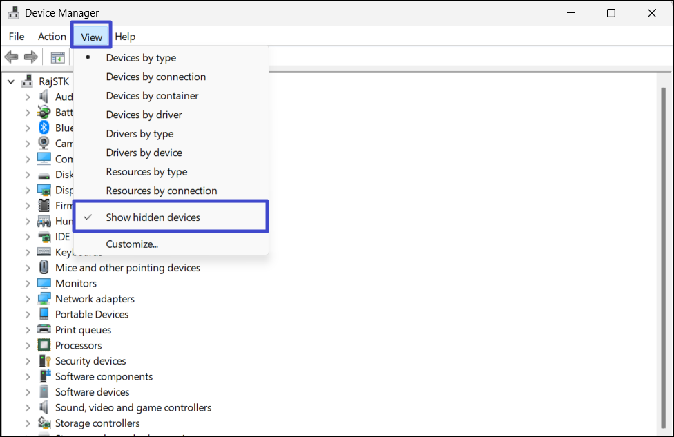2. Kliknij „Pogląd"menu i sprawdź, czy przed „Pokaż ukryte urządzenia”. Jeśli nie ma zaznaczenia, kliknij opcję „Pokaż ukryte urządzenia” opcja przeglądania ukrytych urządzeń.