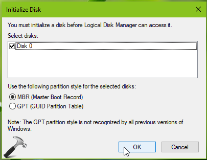 3.Możesz teraz zamknąćWiersz poleceńi otwórz przystawkę Zarządzanie dyskami. Zostaniesz teraz bezpośrednio poproszony o zainicjowanie dysku, jak pokazano poniżej. Możesz teraz także ręcznie zainicjować dysk, klikając dysk prawym przyciskiem myszy i wybierającZainicjuj dyskopcja.