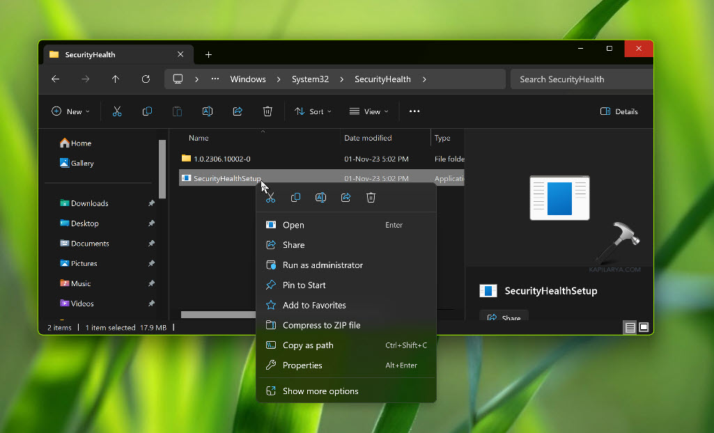 Jeśli folder SecurityHealth jest pusty i nie ma pliku o nazwie SecurityHealthSetup.exe:Możesz pobrać plikSecurityHealthSetup.exezTutaj. Utworzyłem plik ZIP zawierającySecurityHealthSetup.exe. Możesz rozpakować plik ZIP i umieścić goSecurityHealthSetup.exeplik na pulpicie i kliknij opcję Uruchom jako administrator.